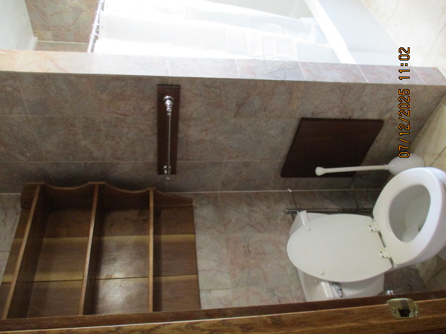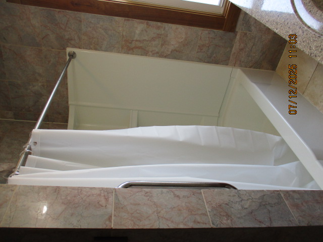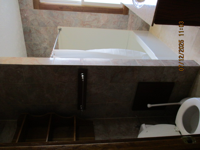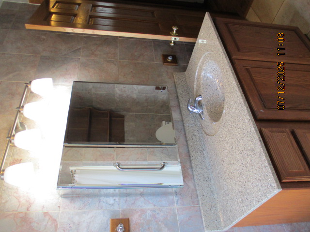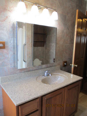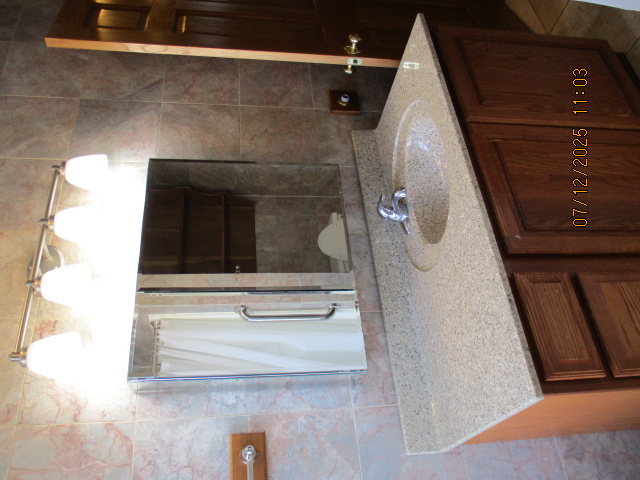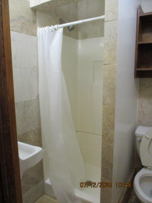 Downstairs Bathroom with Marble walls with Shower, Entry door to basement