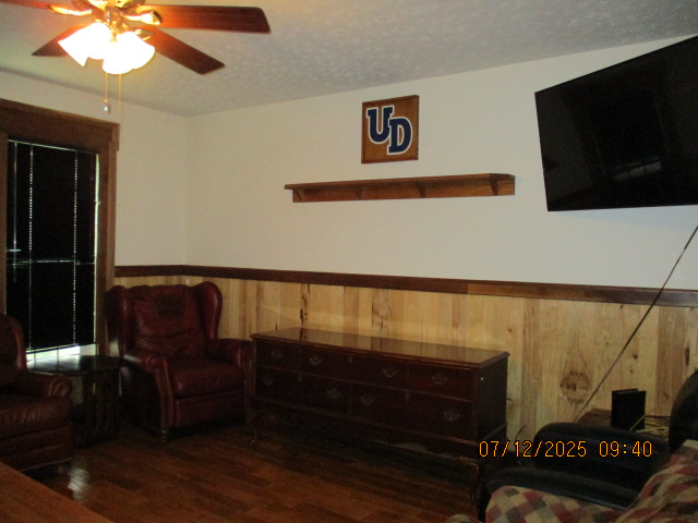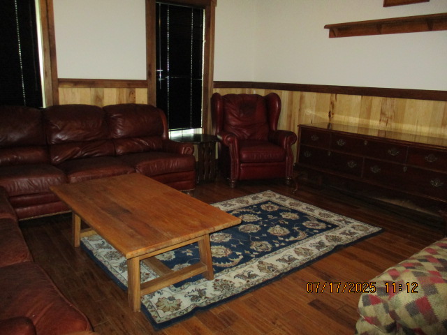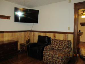 Oak Wood Flooring, Fan, Wall mounted flat screen television, coffee table, End Tables, Simply beautiful with