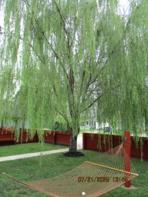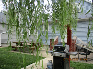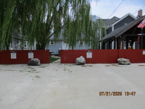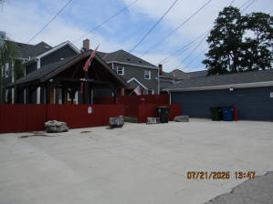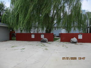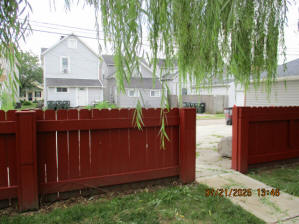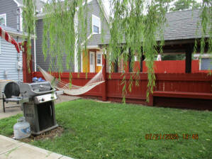 Backyard with security lighting and off street parking with lighting. Privacy fence in backyard, hammock, picnic table, gas grill, and custom bench in fence, next door and open backyard with our home at 42 Frank This page last updated 08/05/25 |