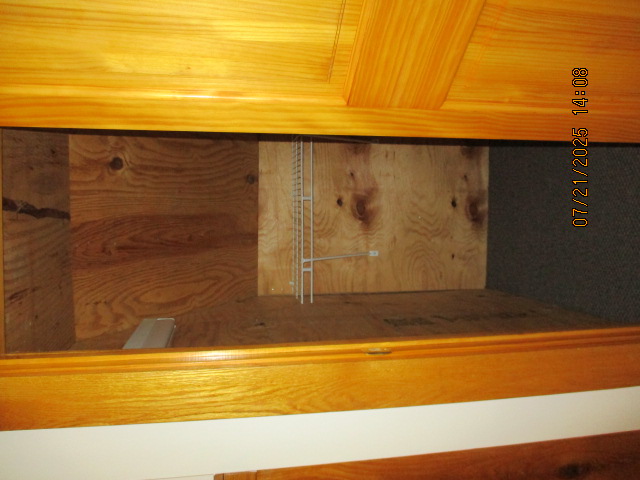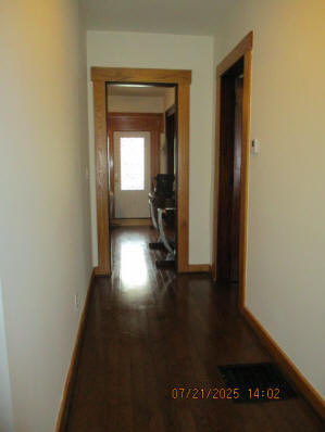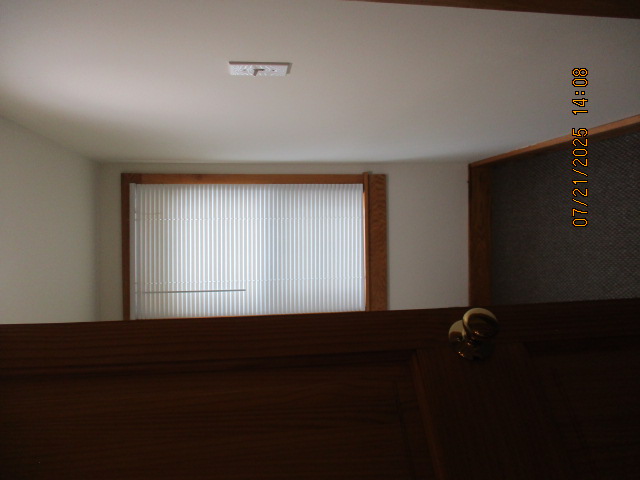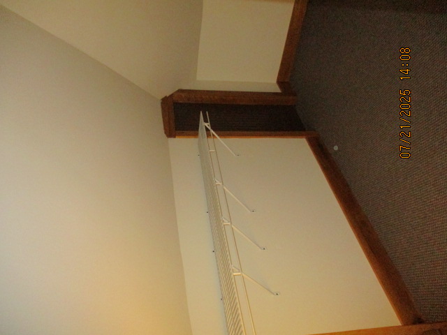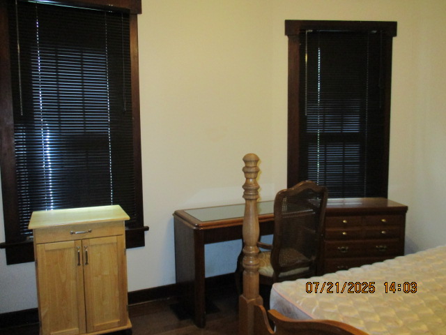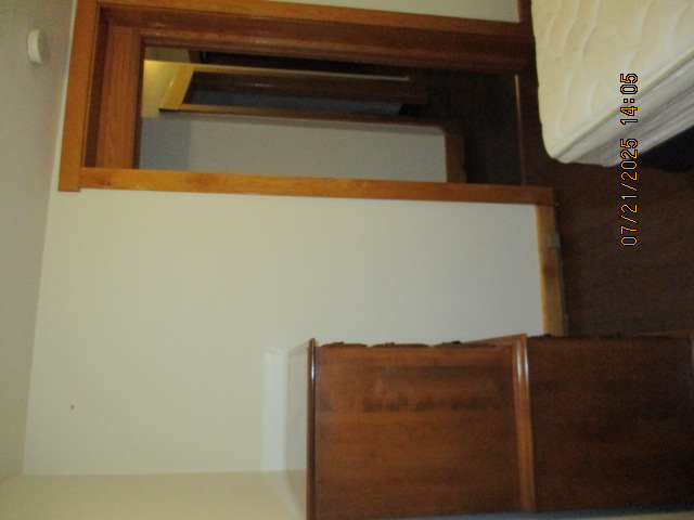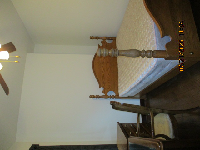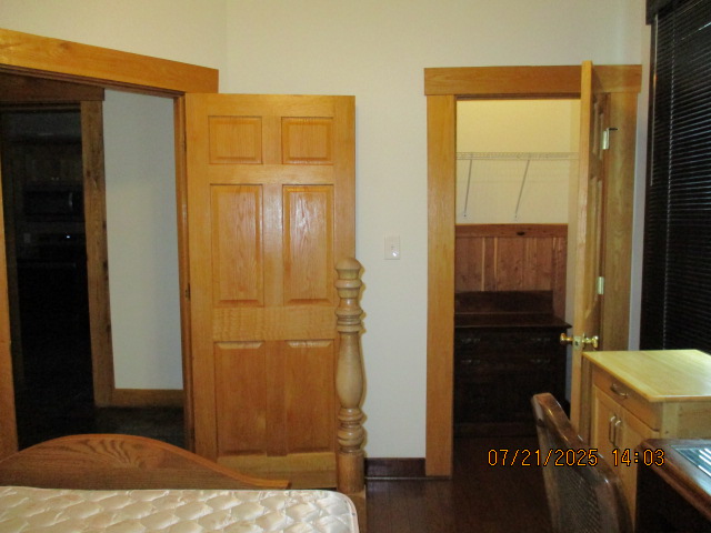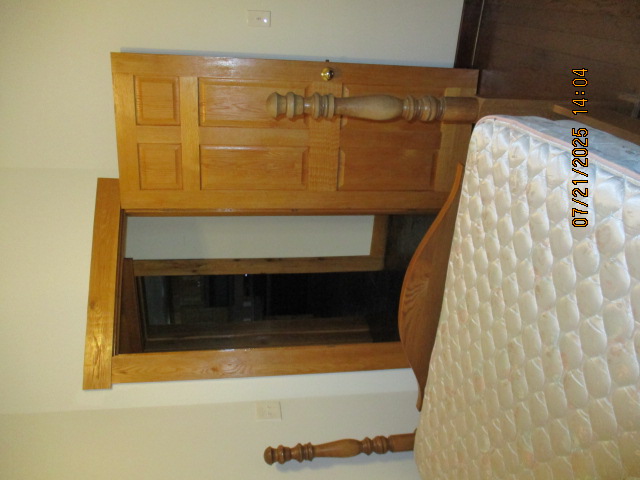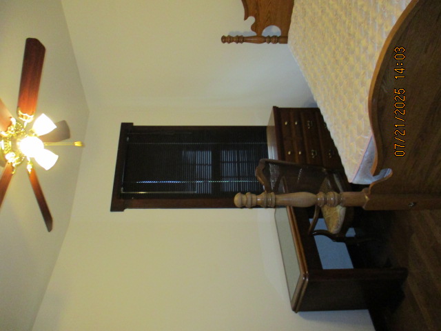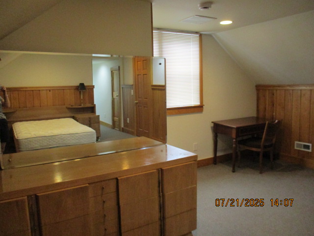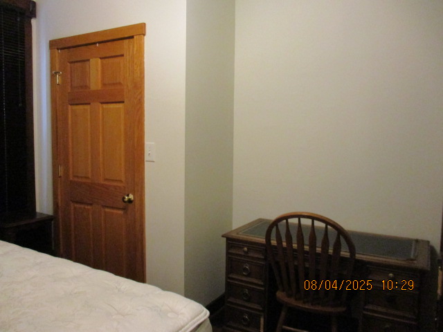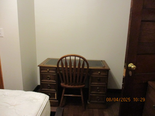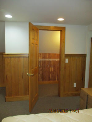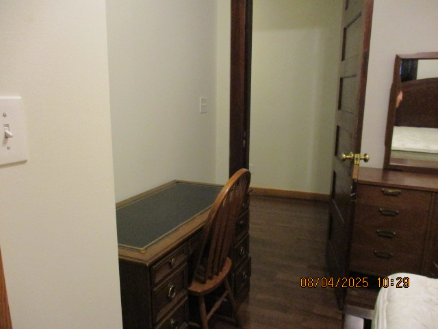 Middle downstairs bedroom with solid oak wood flooring, cedar lined closet, ceiling fan, and currently with queen bed Downstairs study area and hallway leading to bathroom, upstairs loft area, and basement entrance, study room currently with full bed, desk, and dresser