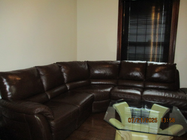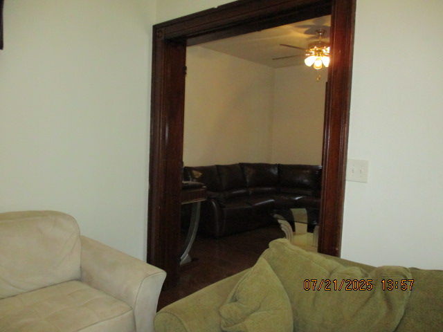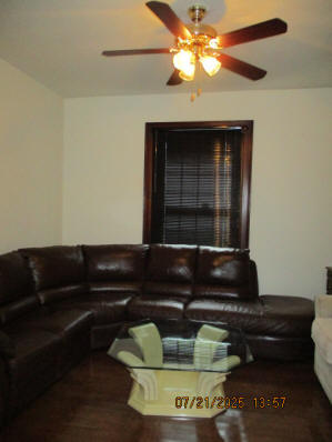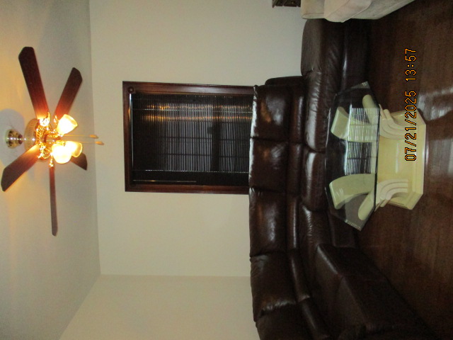 Living Room with solid oak wood flooring, ceiling fan, leather sectional sofa, and steel front entrance door with black walnut trim, hallway leading to downstairs bedrooms. Front downstairs bedroom with solid oak wood flooring, cedar lined closet, currently with queen wood bed, desk, dresser, and ceiling fan.