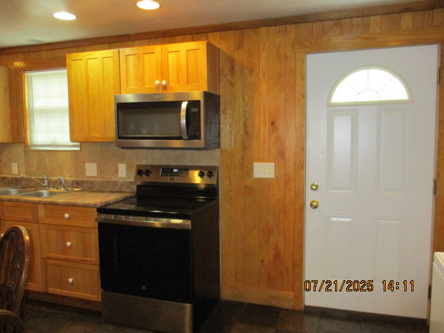 Kitchen with hickory cabinets, oak wainscoting, microwave, dishwasher, premium commercial grade washer and dryer, steel back entry door, and slate tile flooring.