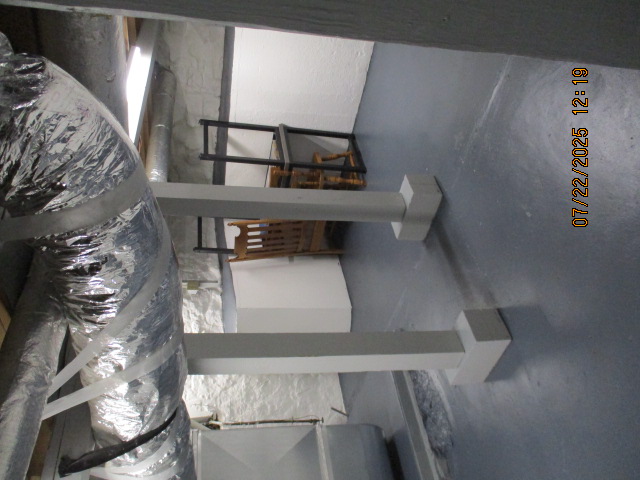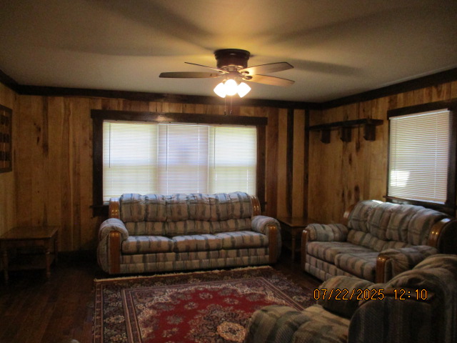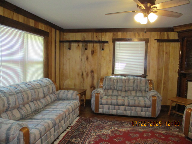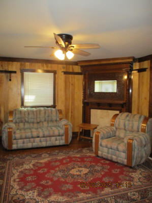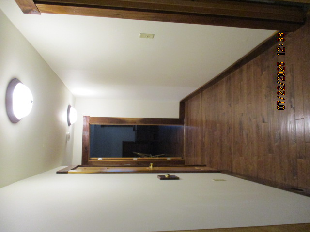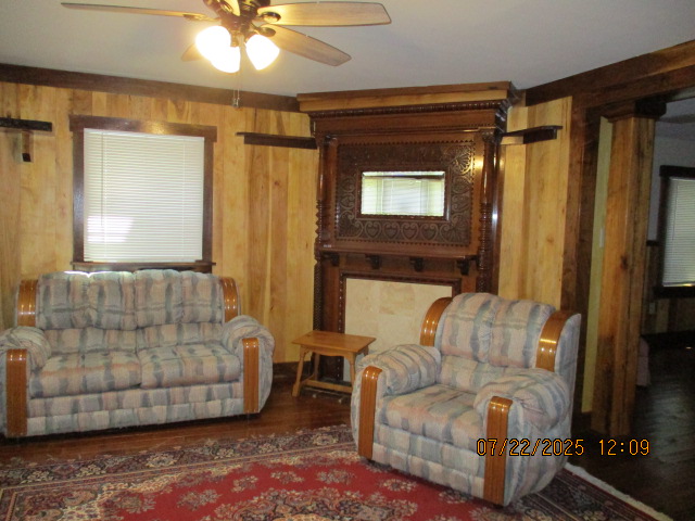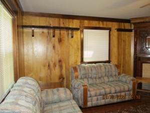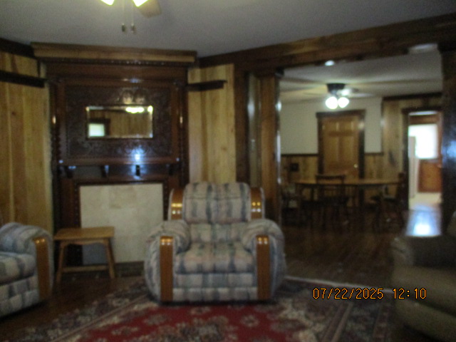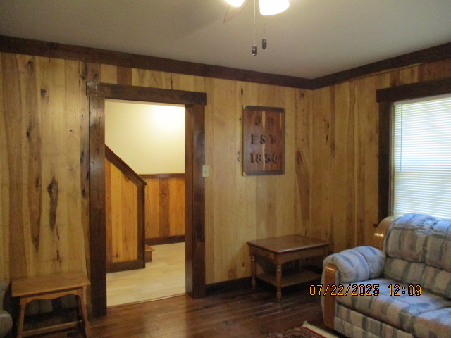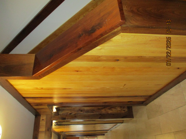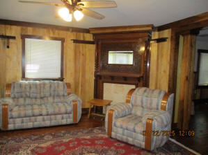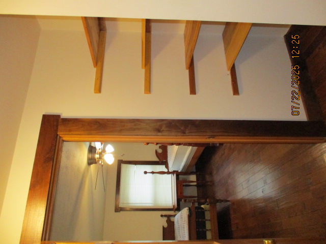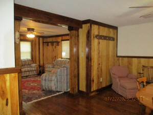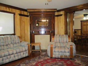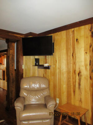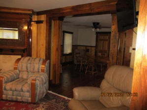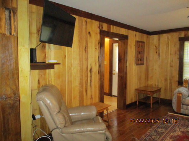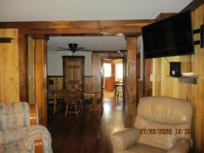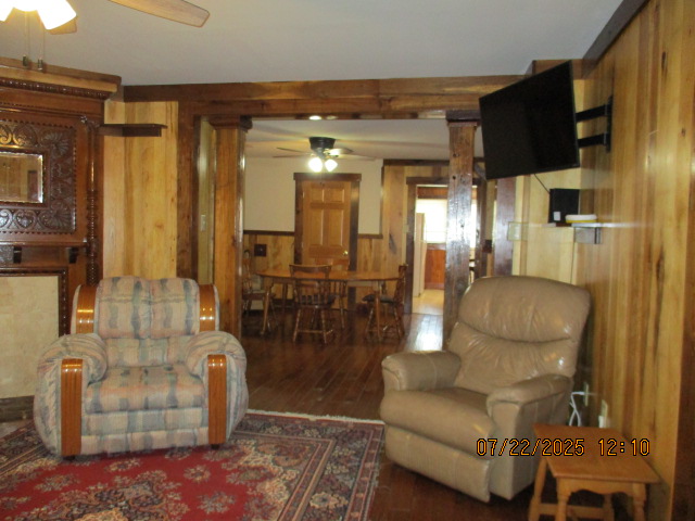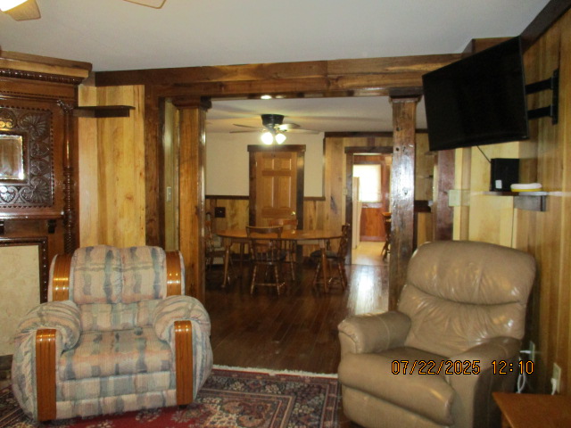 Living room with 100 year old mantle, wall mounted television, walnut shelving, solid hickory wood flooring, walnut window trim, lovely oak beams in entryway from living room to dining room
