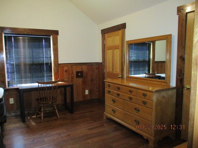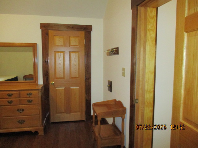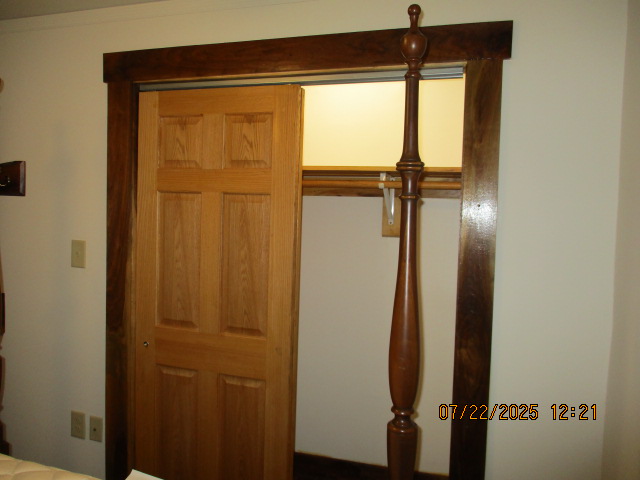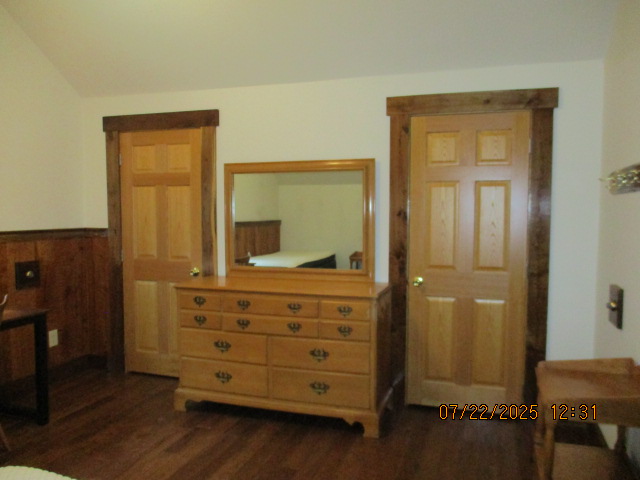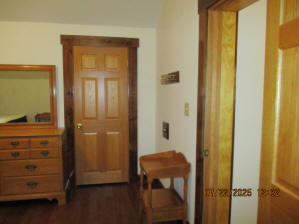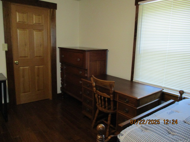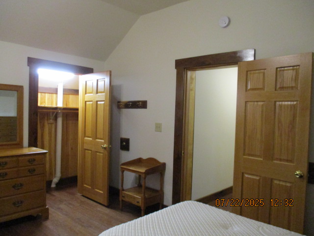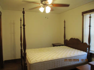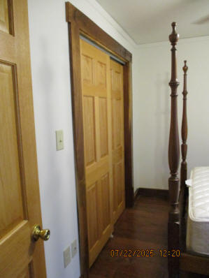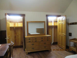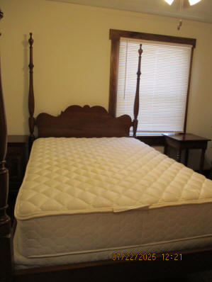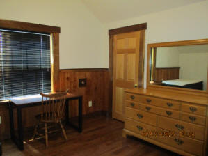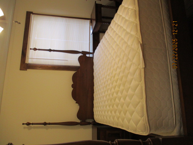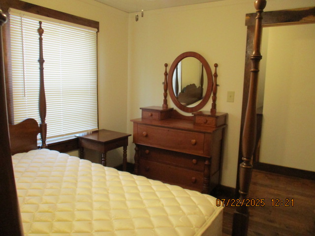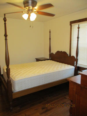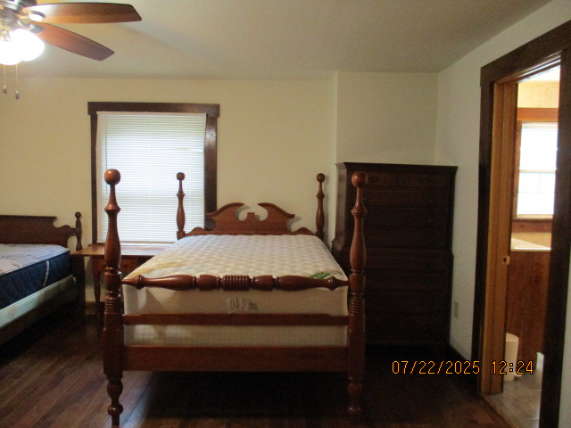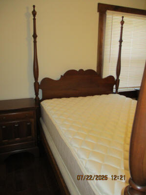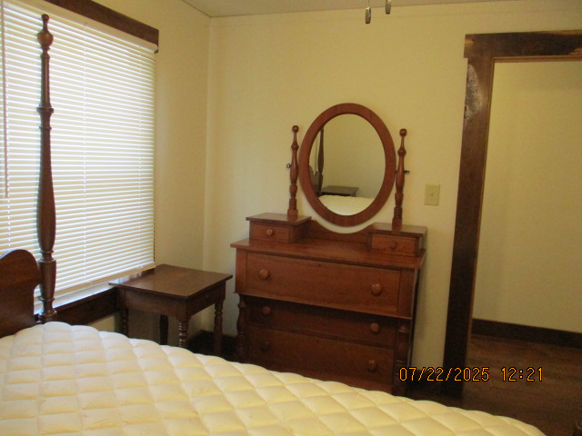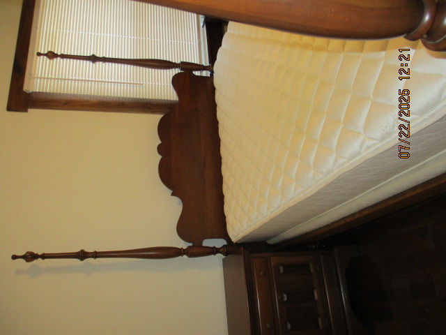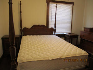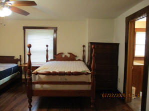 First upstairs bedroom at top of stairs, with beautiful wood poster full bed, dresser with mirror, large closet and end tables, solid hickory wood flooring