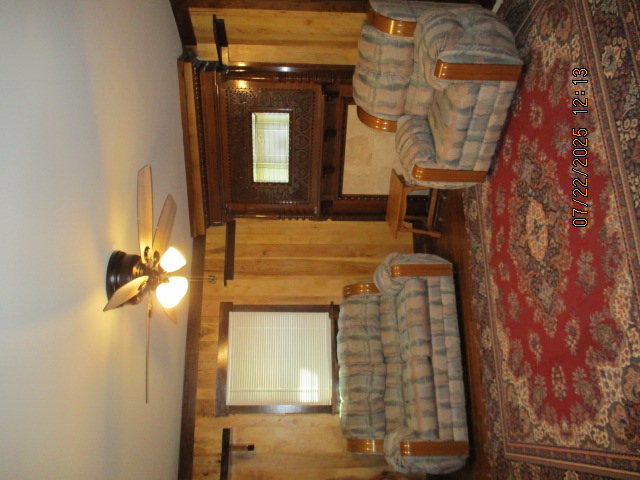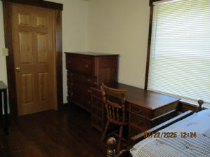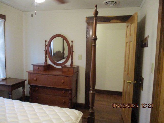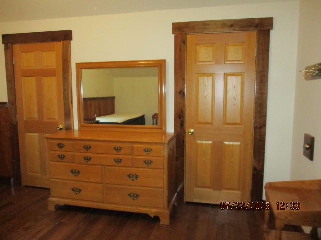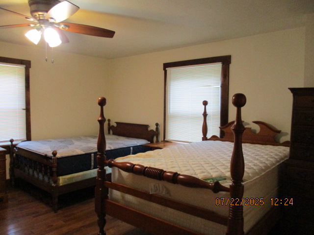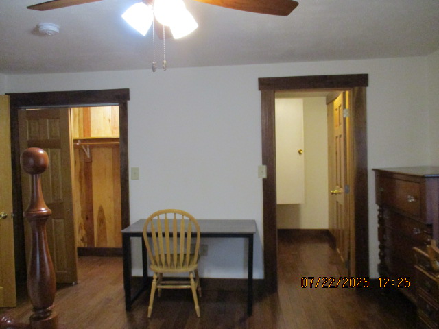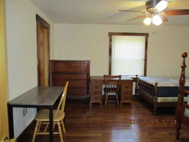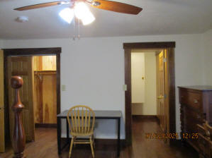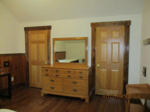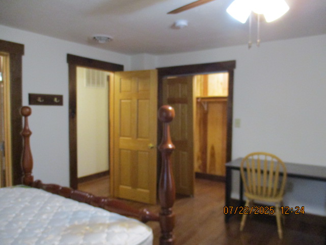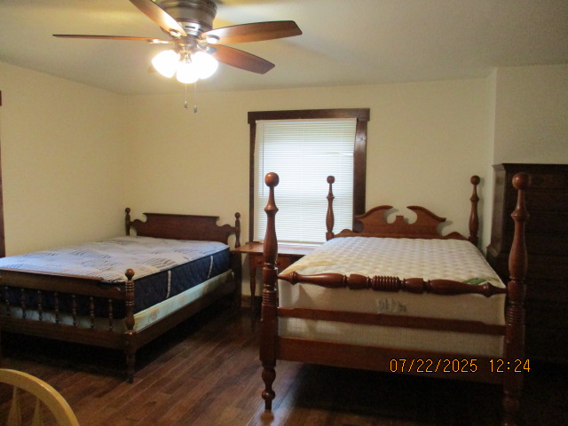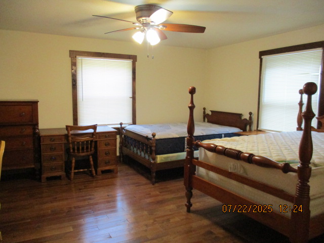 Front bedroom with two full wood beds, dressers, desks, and two large closets, solid hickory wood flooring, ceiling fan, on suite full bathroom with marble tile walls, bathtub, custom built bathroom vanity