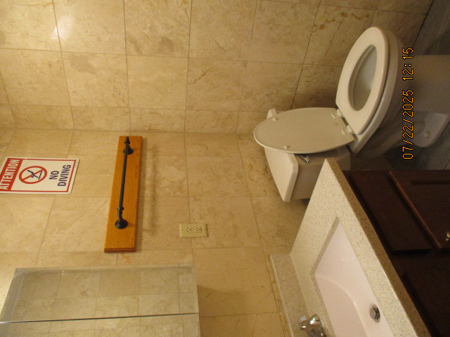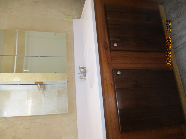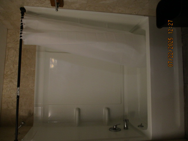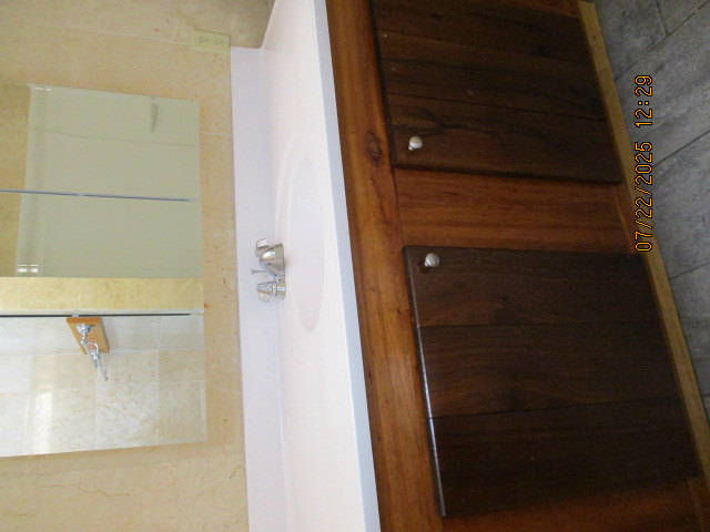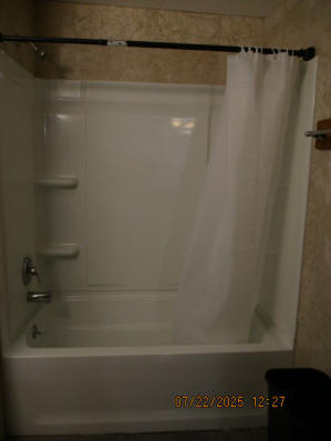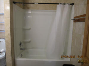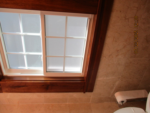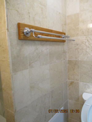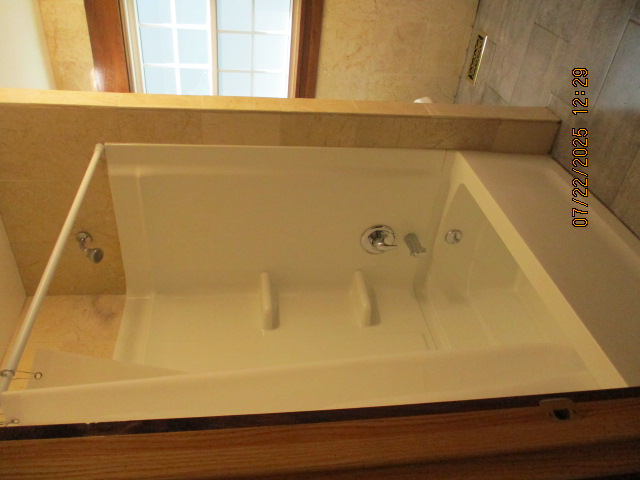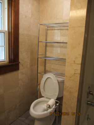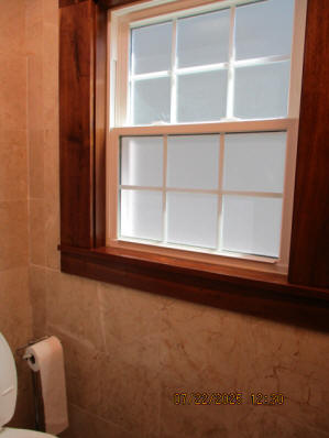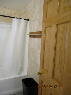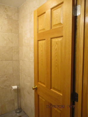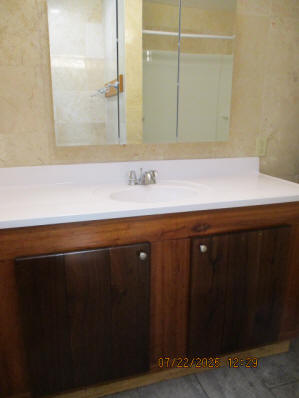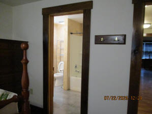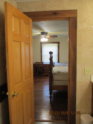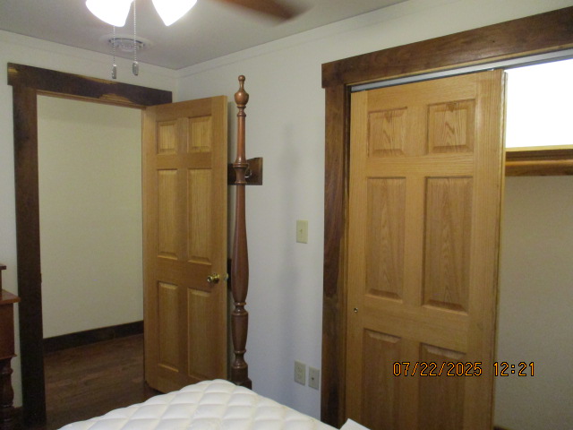 Front bedroom with two full wood beds, dressers, desks, and two large closets, solid hickory wood flooring, ceiling fan, on suite full bathroom with marble tile walls, bathtub, custom built bathroom vanity