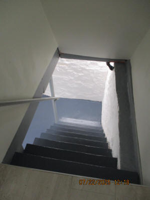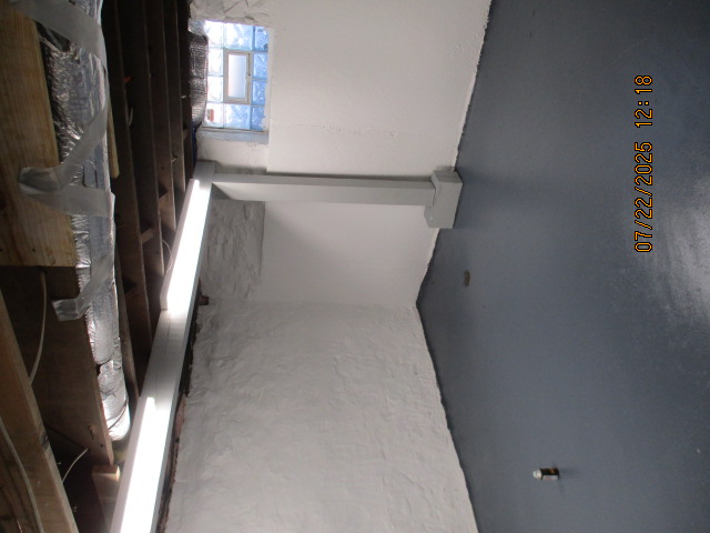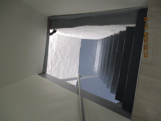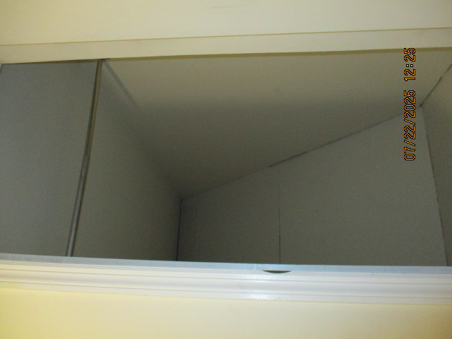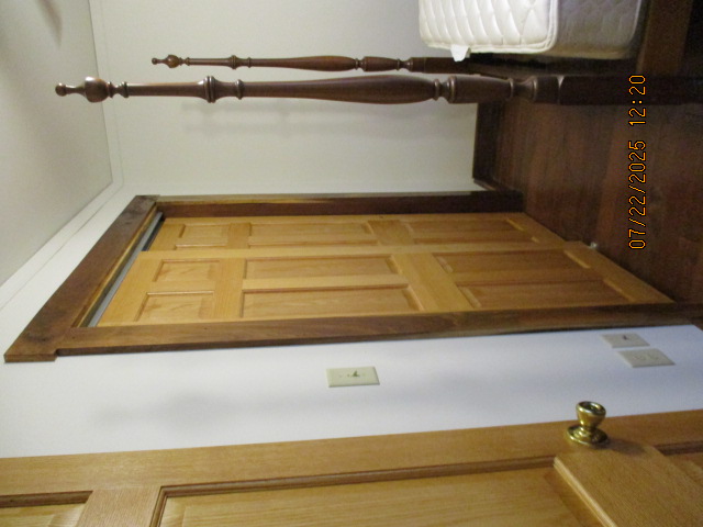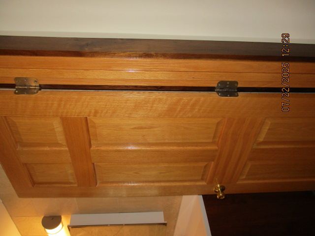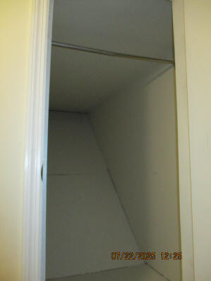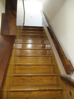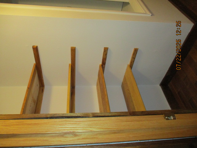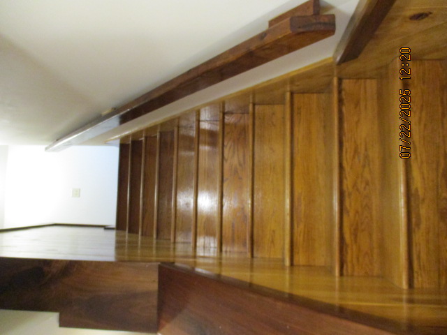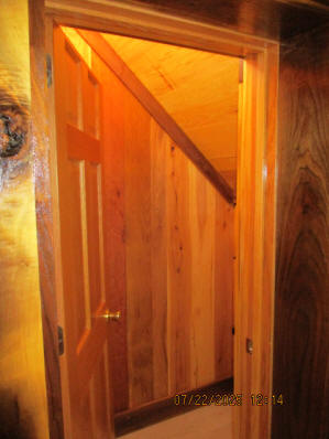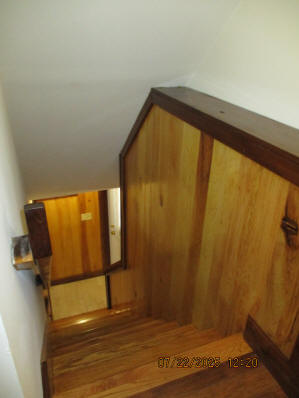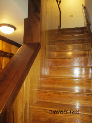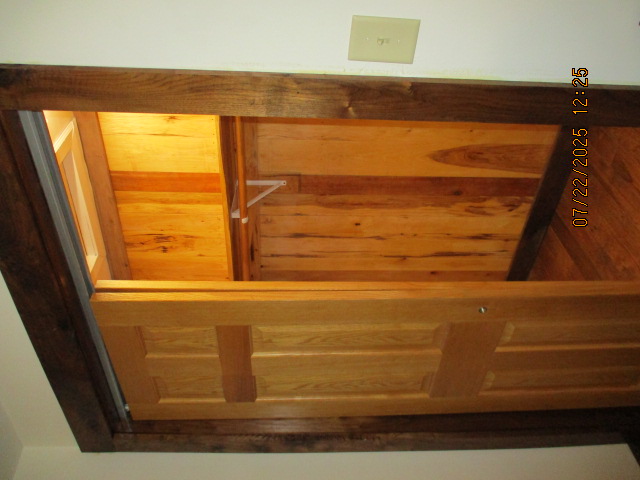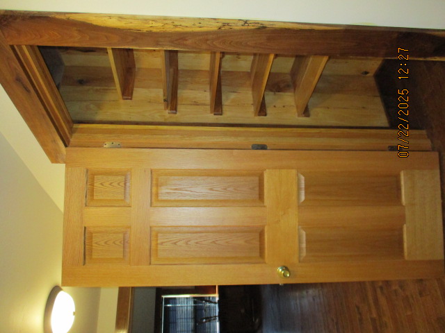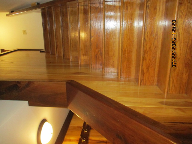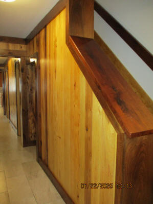 Custom built oak staircase with black walnut handrail, upstairs hallway with storage closet