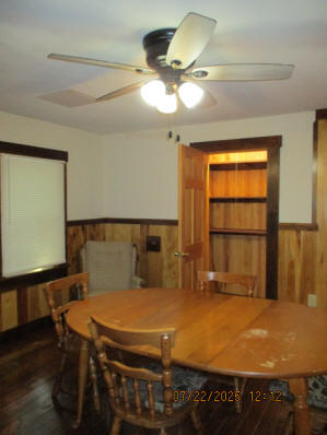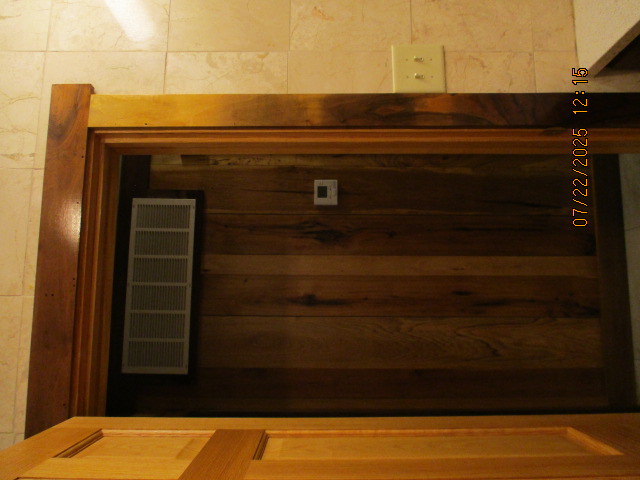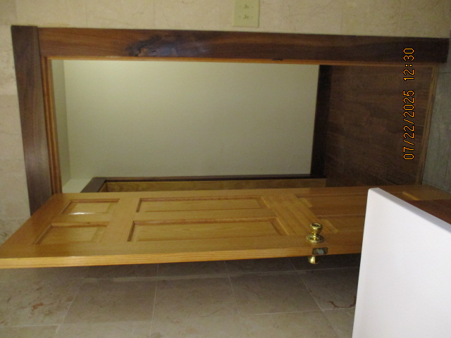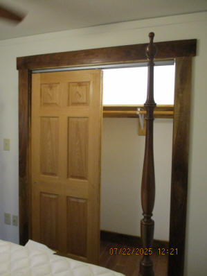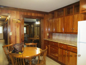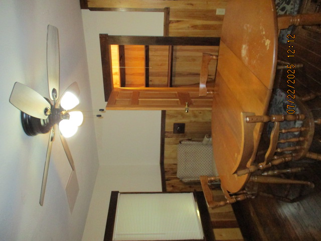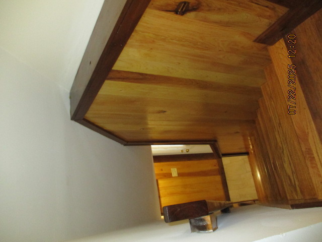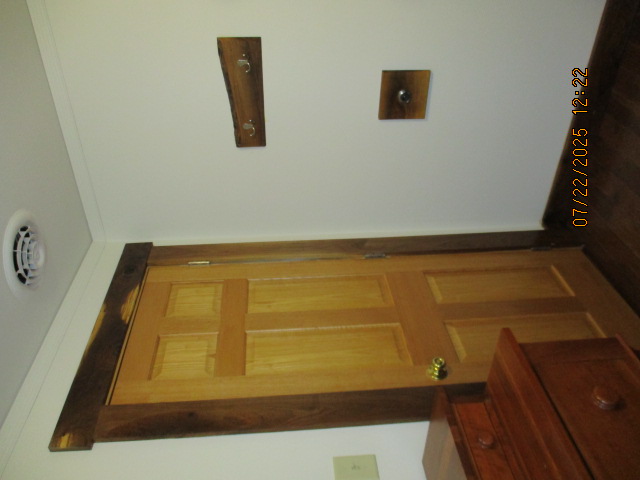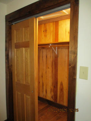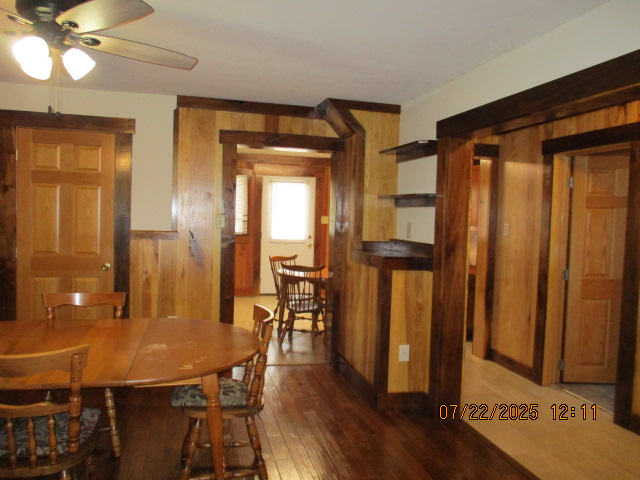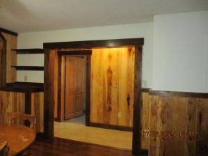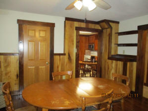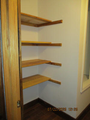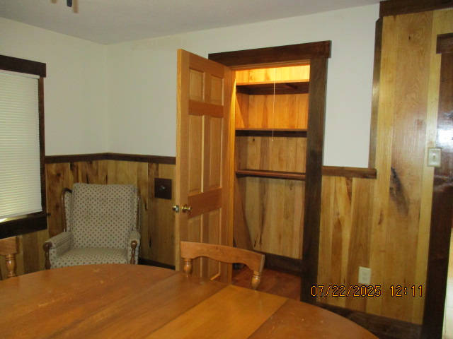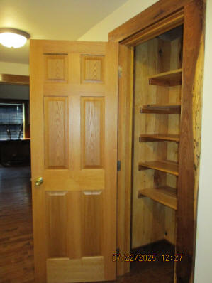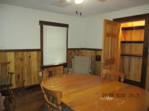 Dining room with solid hickory wood flooring, storage closet, walnut shelving and trim