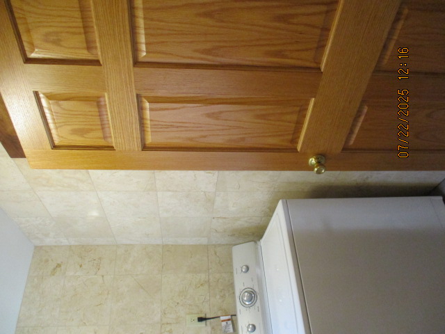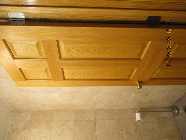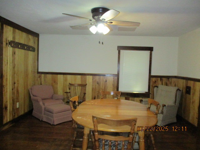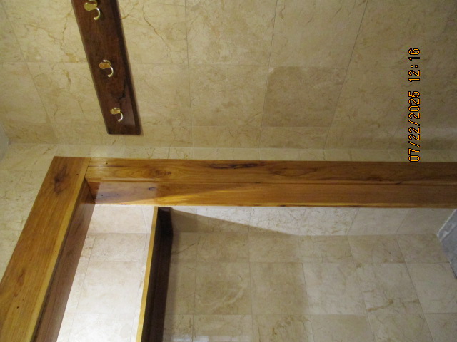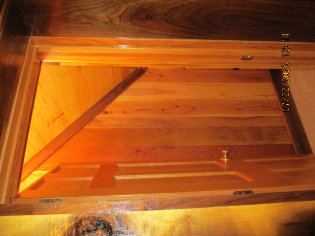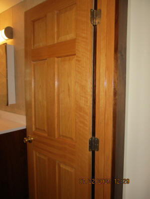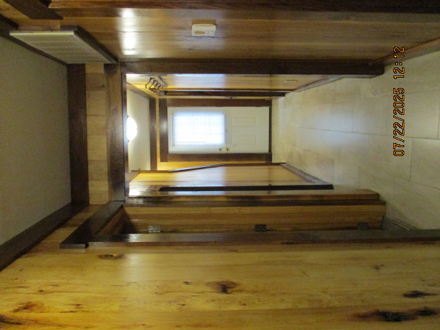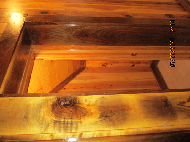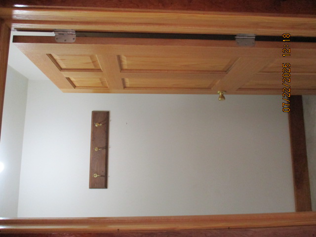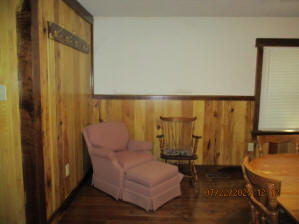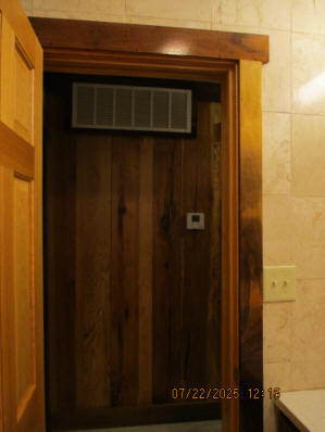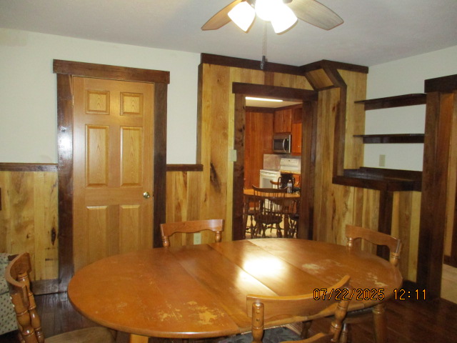 Dining room with solid hickory wood flooring, storage closet, walnut shelving and trim