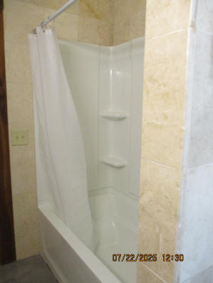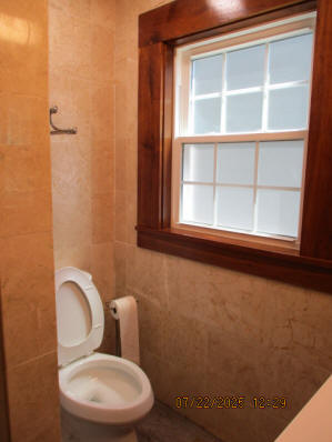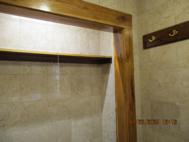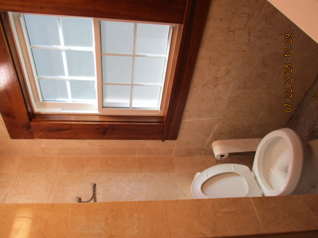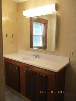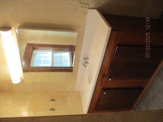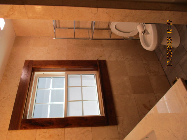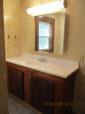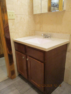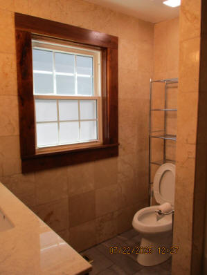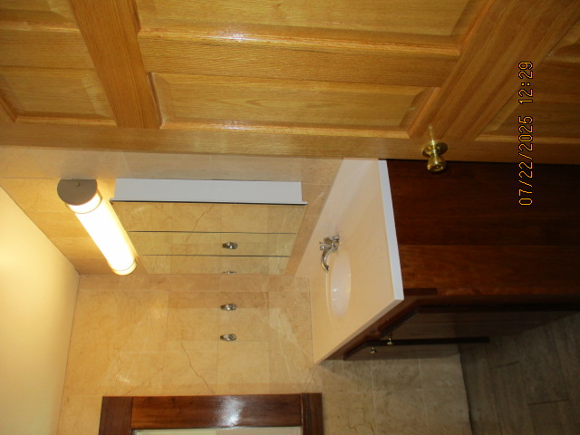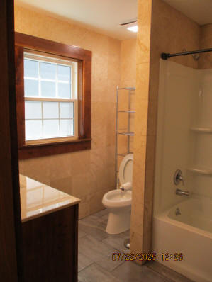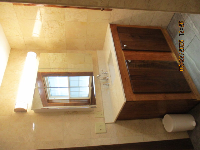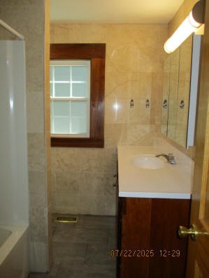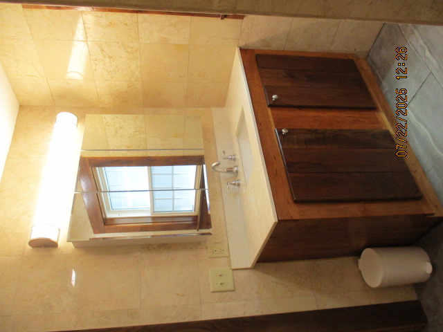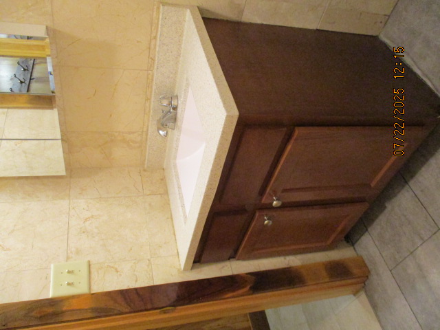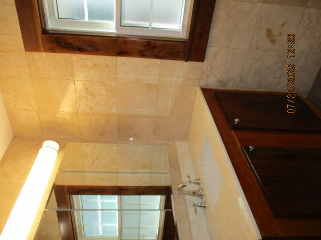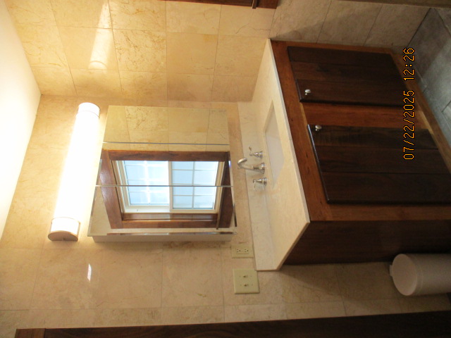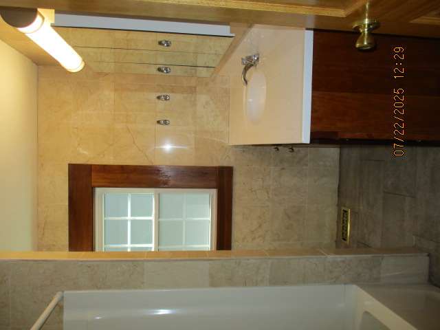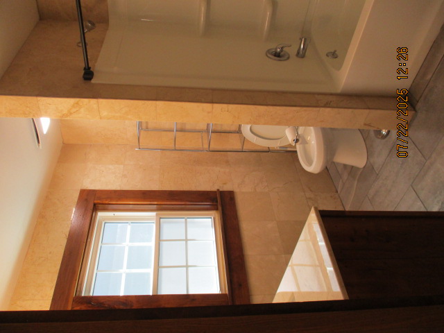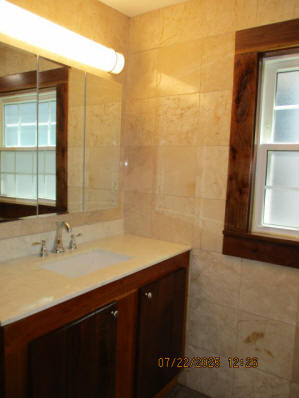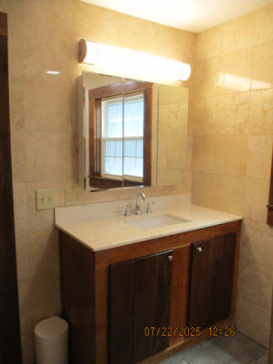 Full bathroom off of upstairs hallway with stone tile flooring, custom built bathroom vanity