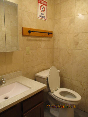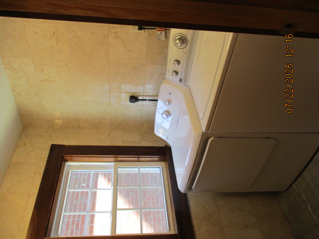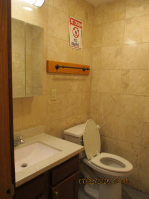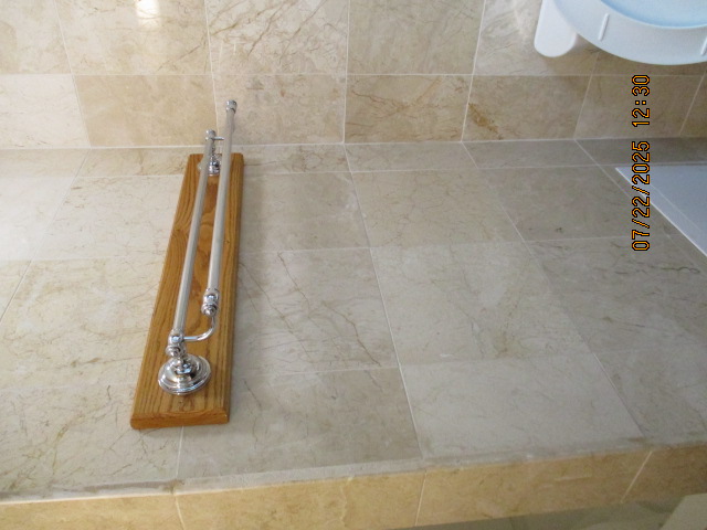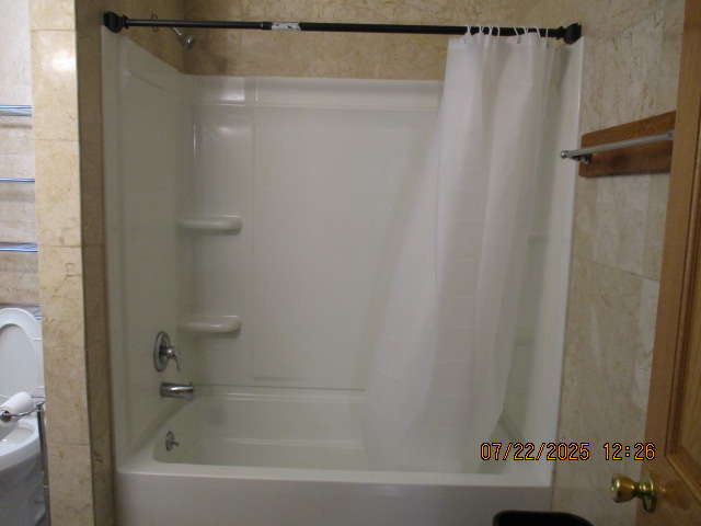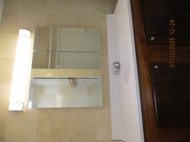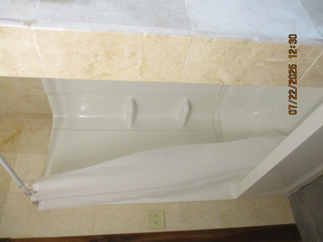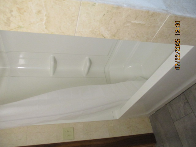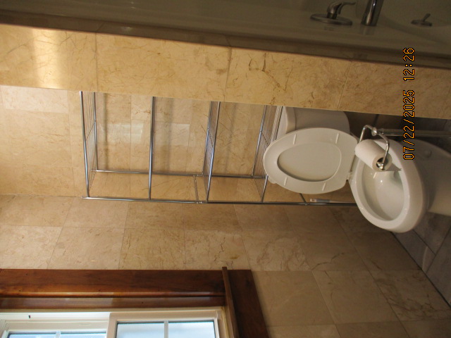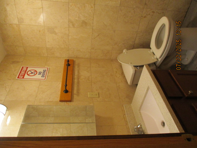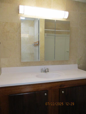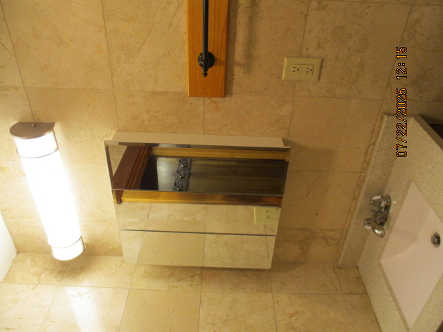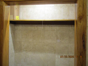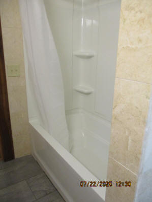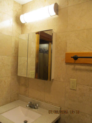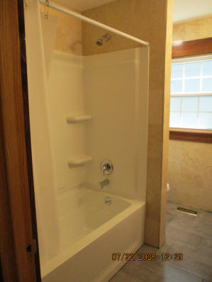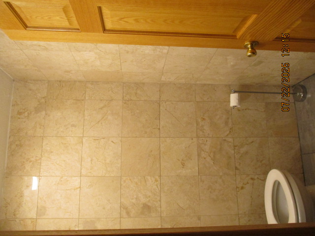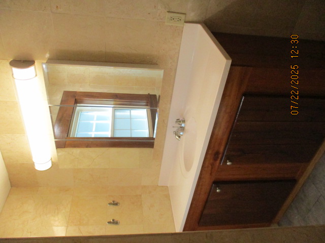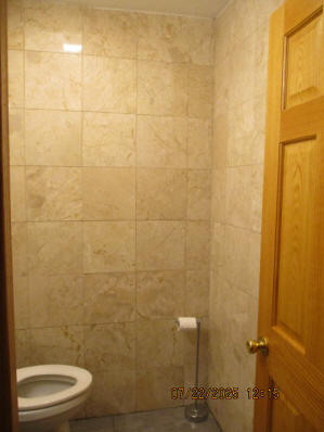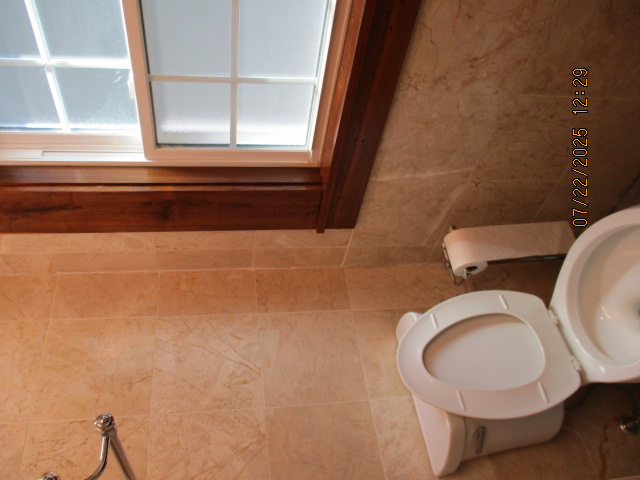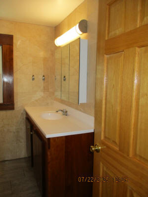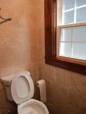 Full bathroom off of upstairs hallway with stone tile flooring, custom built bathroom vanity