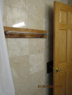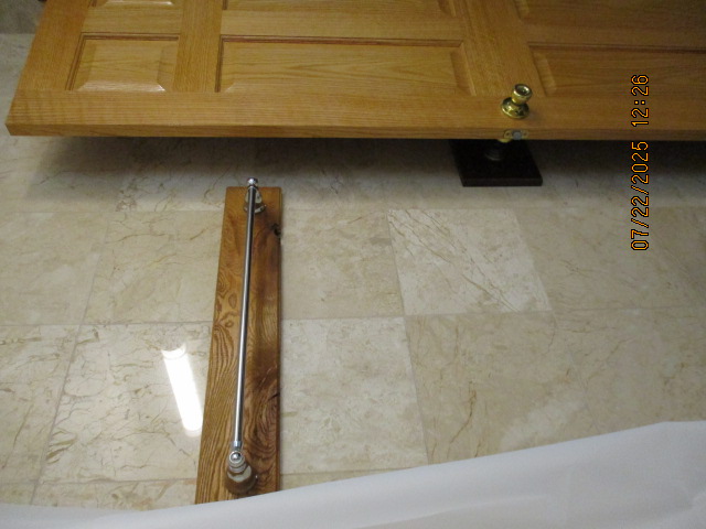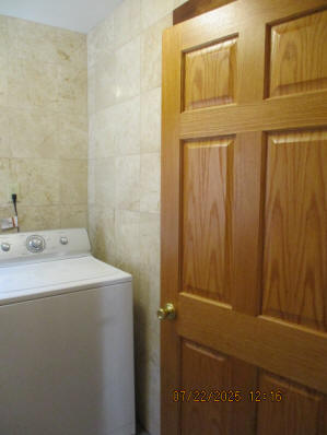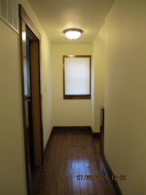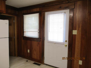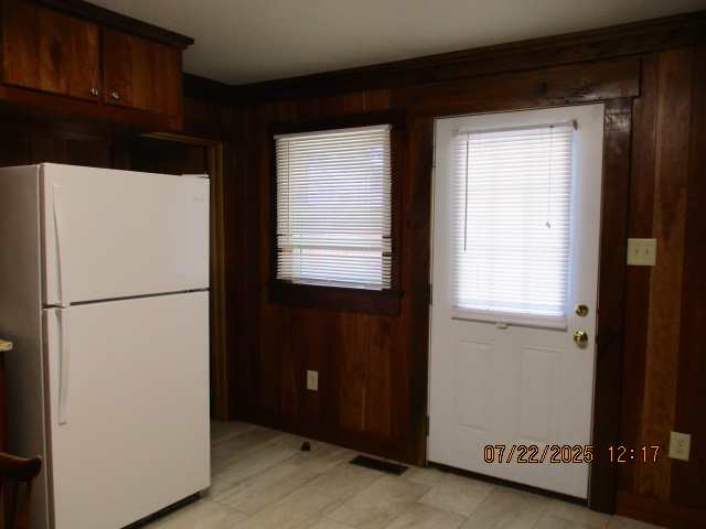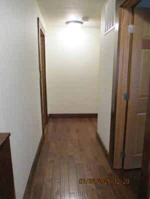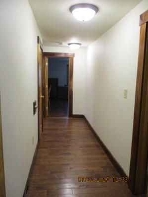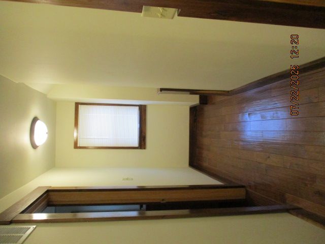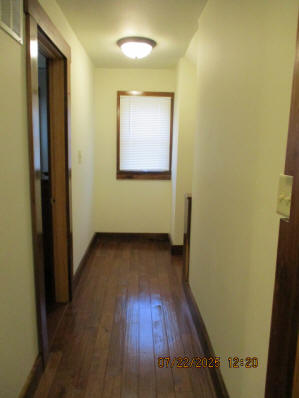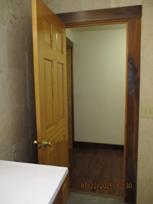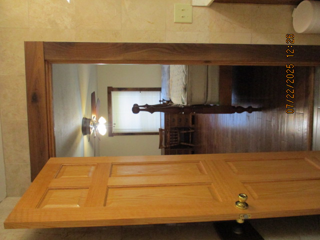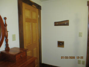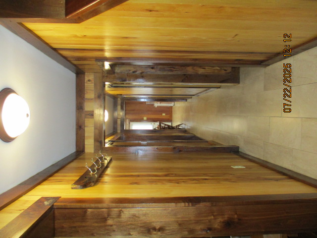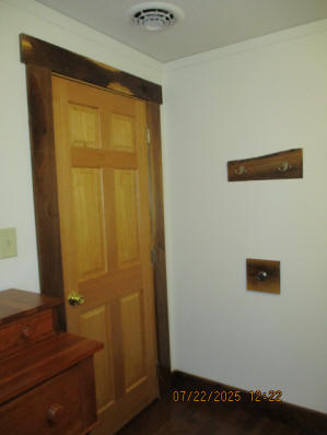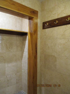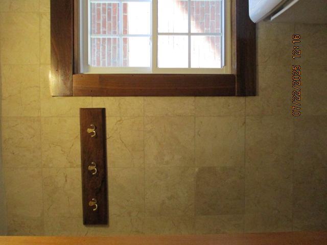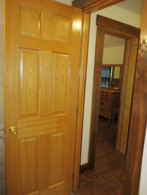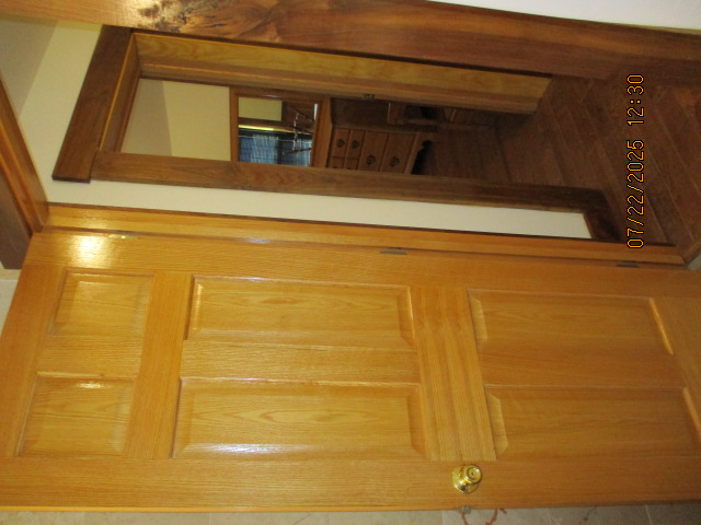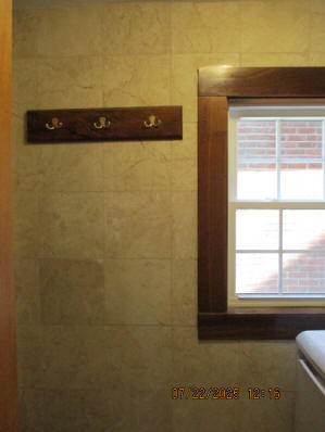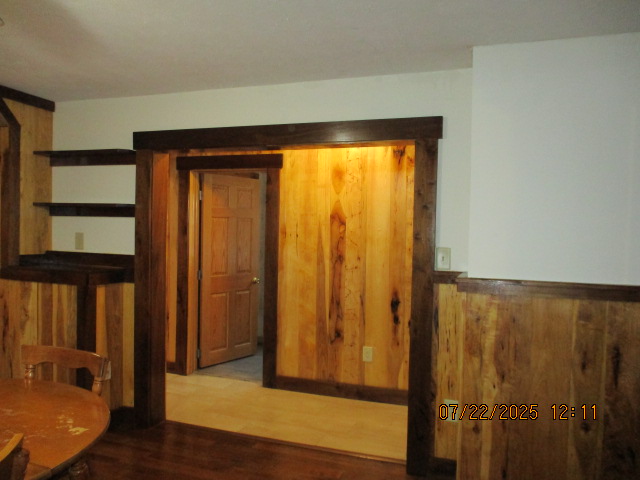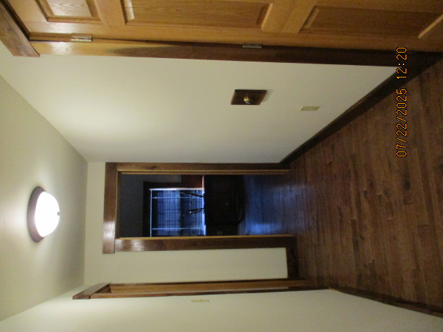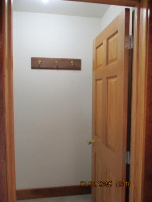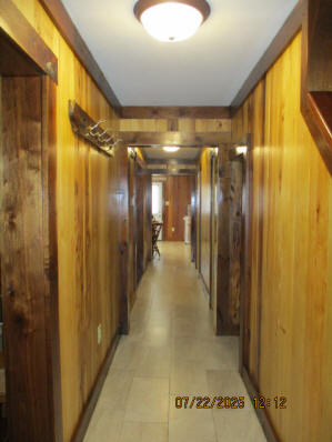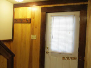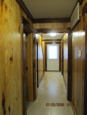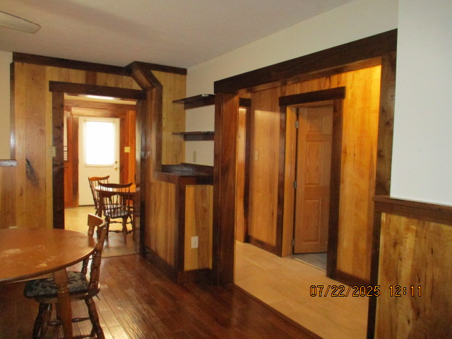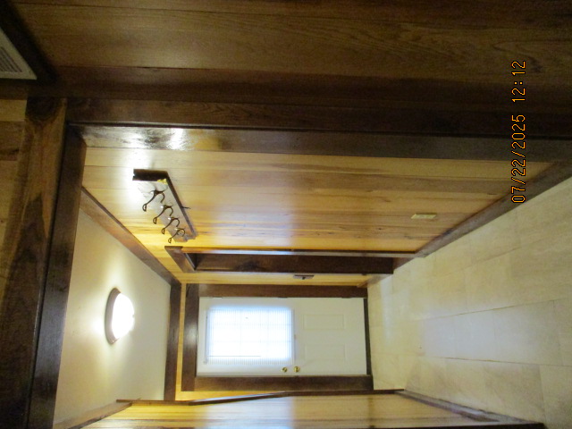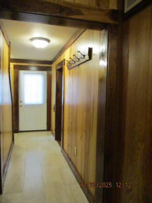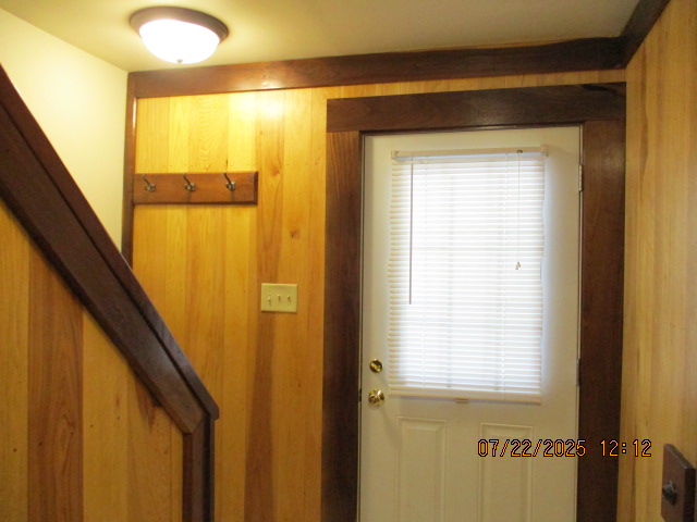 Entry and hallway from front to back of house with a separate laundry room, half bathroom, and closet space, with hickory wainscoting and black walnut trim with coat hooks, steel front entry door