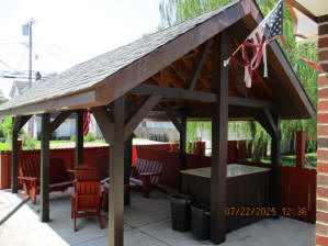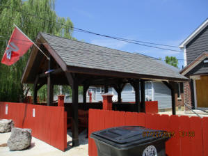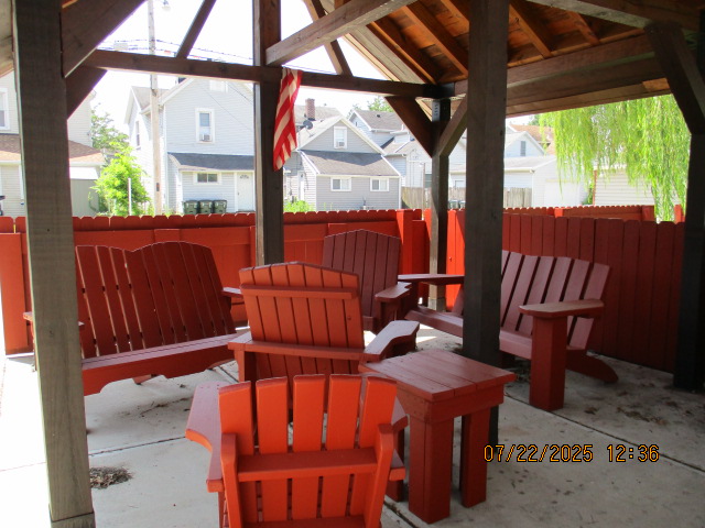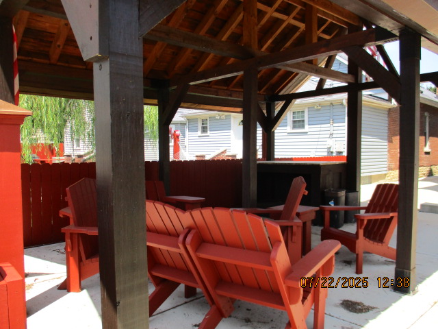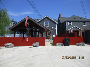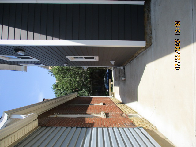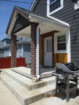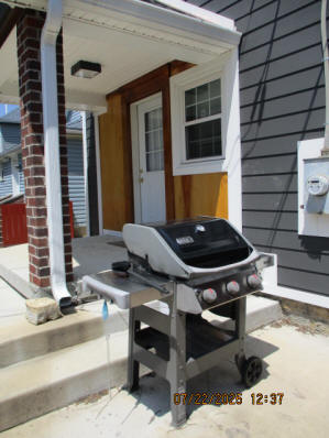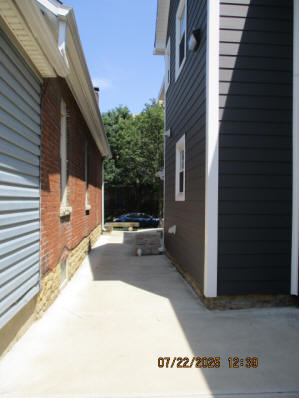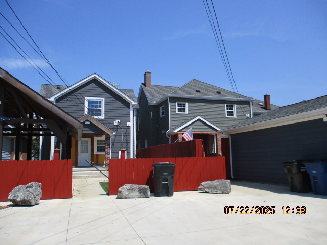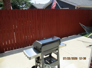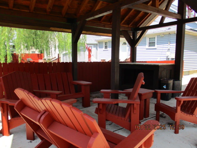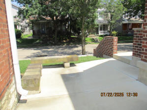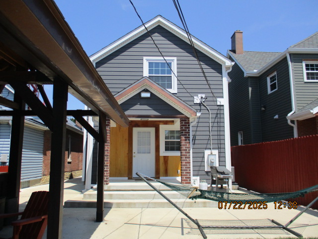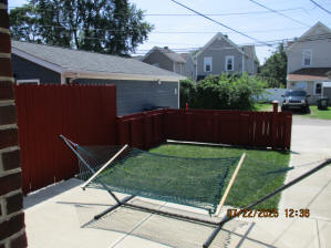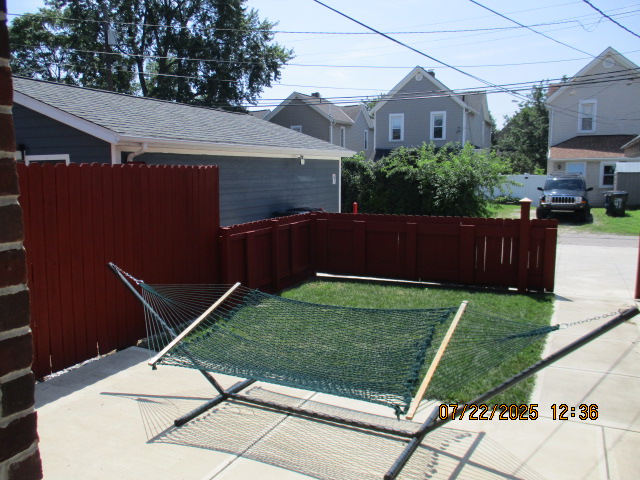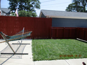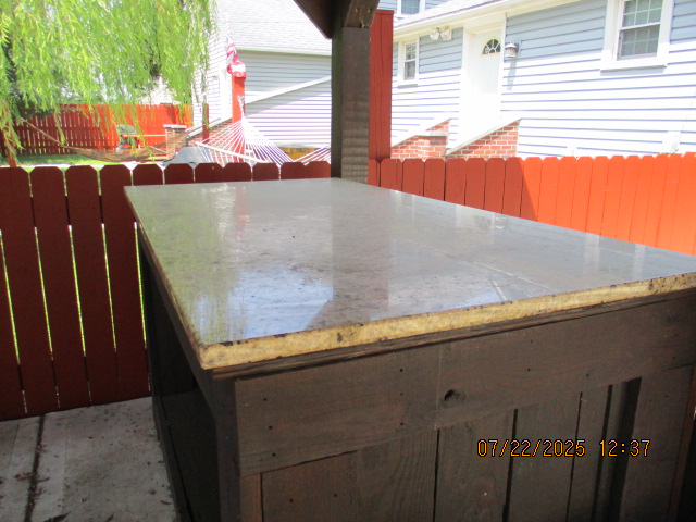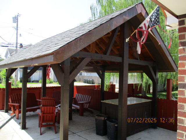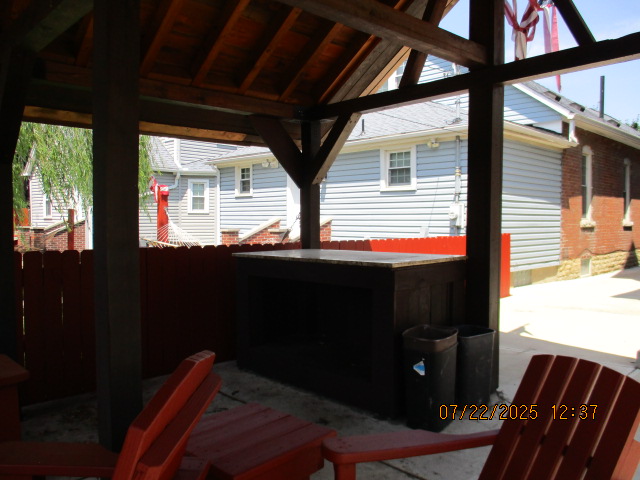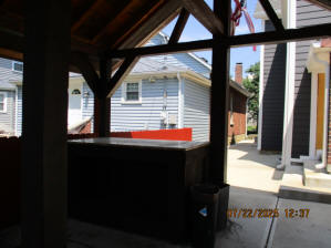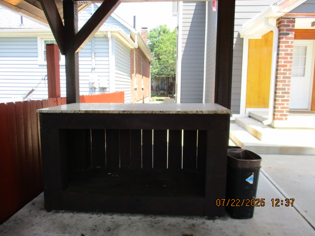 Backyard views with poured concrete pad, brick back porch, parking pad, grill, new pergola, new granite topped bar under pergola!