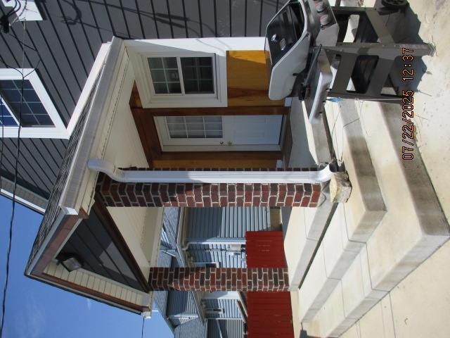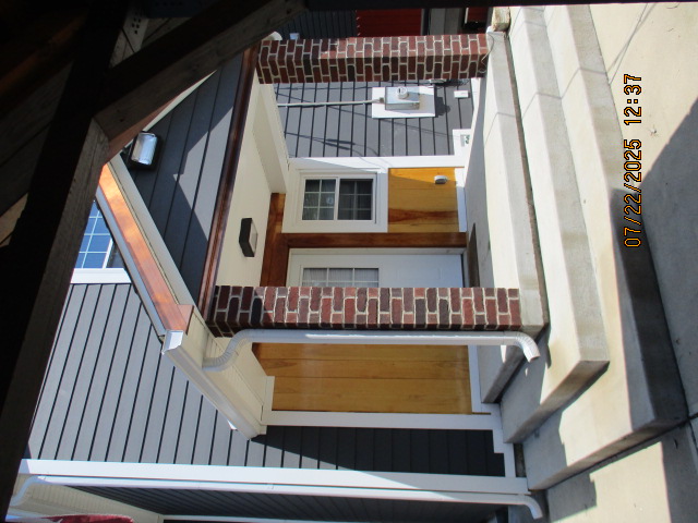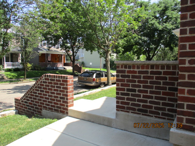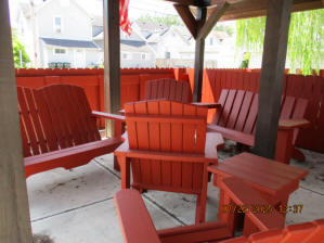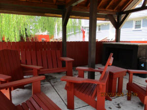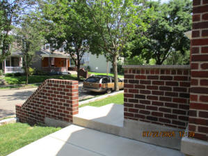 Front and side yard views with brick front porch, stone benches, stone retaining wall, custome built adirondack chairs