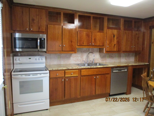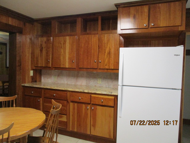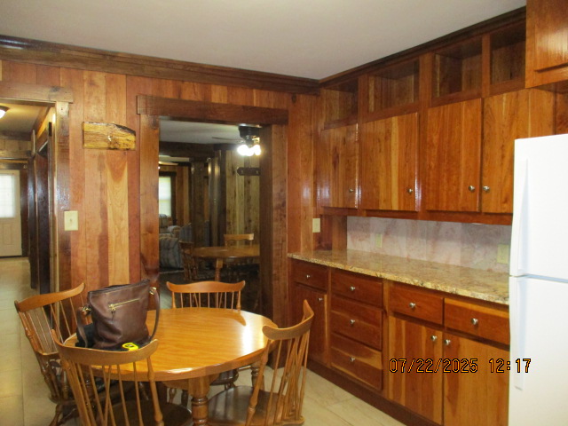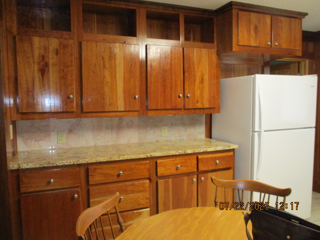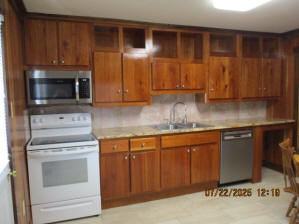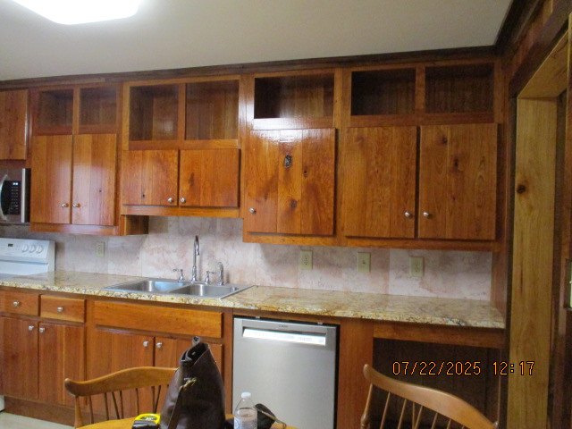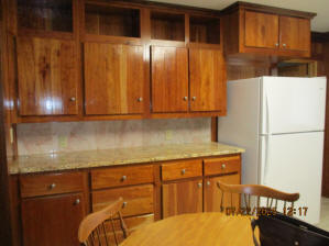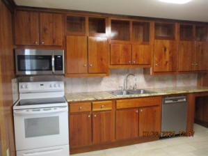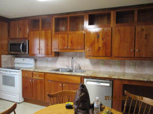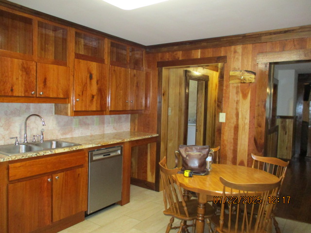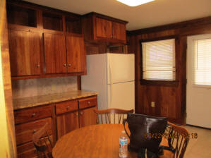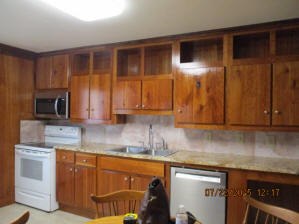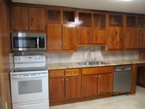 Kitchen with stone tile flooring, custom built cherry cabinets with granite countertops, dishwasher, microwave, table and chairs