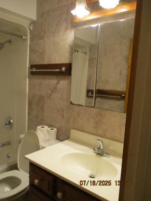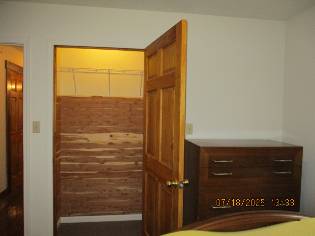 Second (middle) main floor Bedroom currently with wood full bed, Desk, Dresser, cedar lined Closet, mirror, and Nightstand Bathroom with marble tile walls with Bathtub/Shower and Linen closet outside bathroom Third Upstairs Bedroom with Large cedar lined Closet, currently with two wood twin beds, cherry high boy dresser